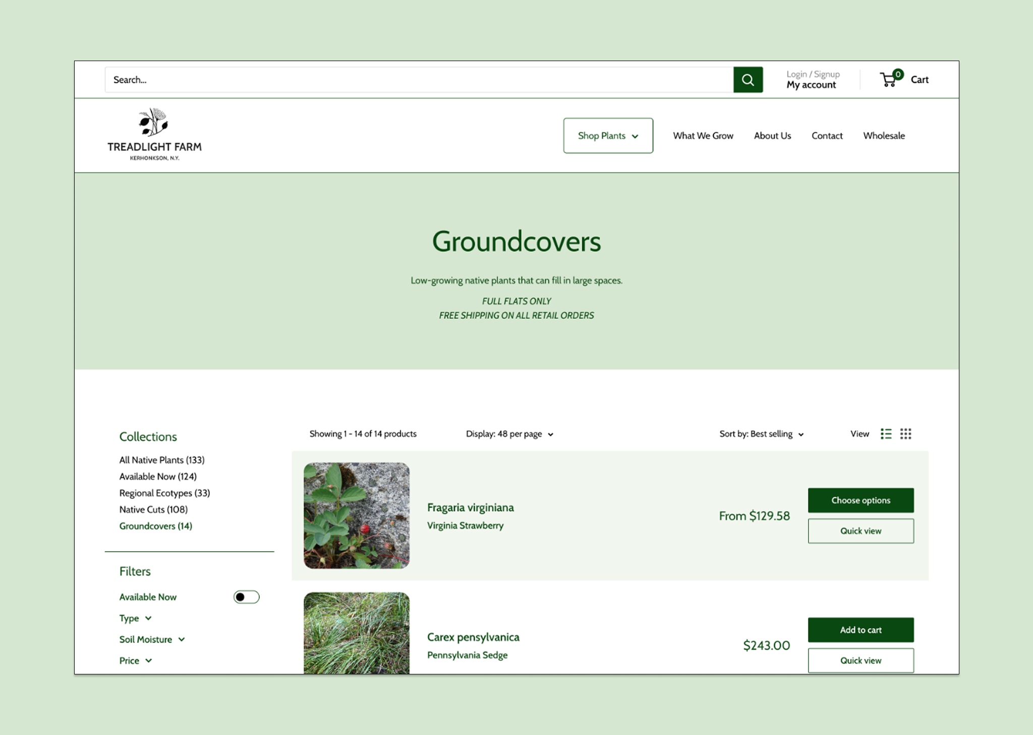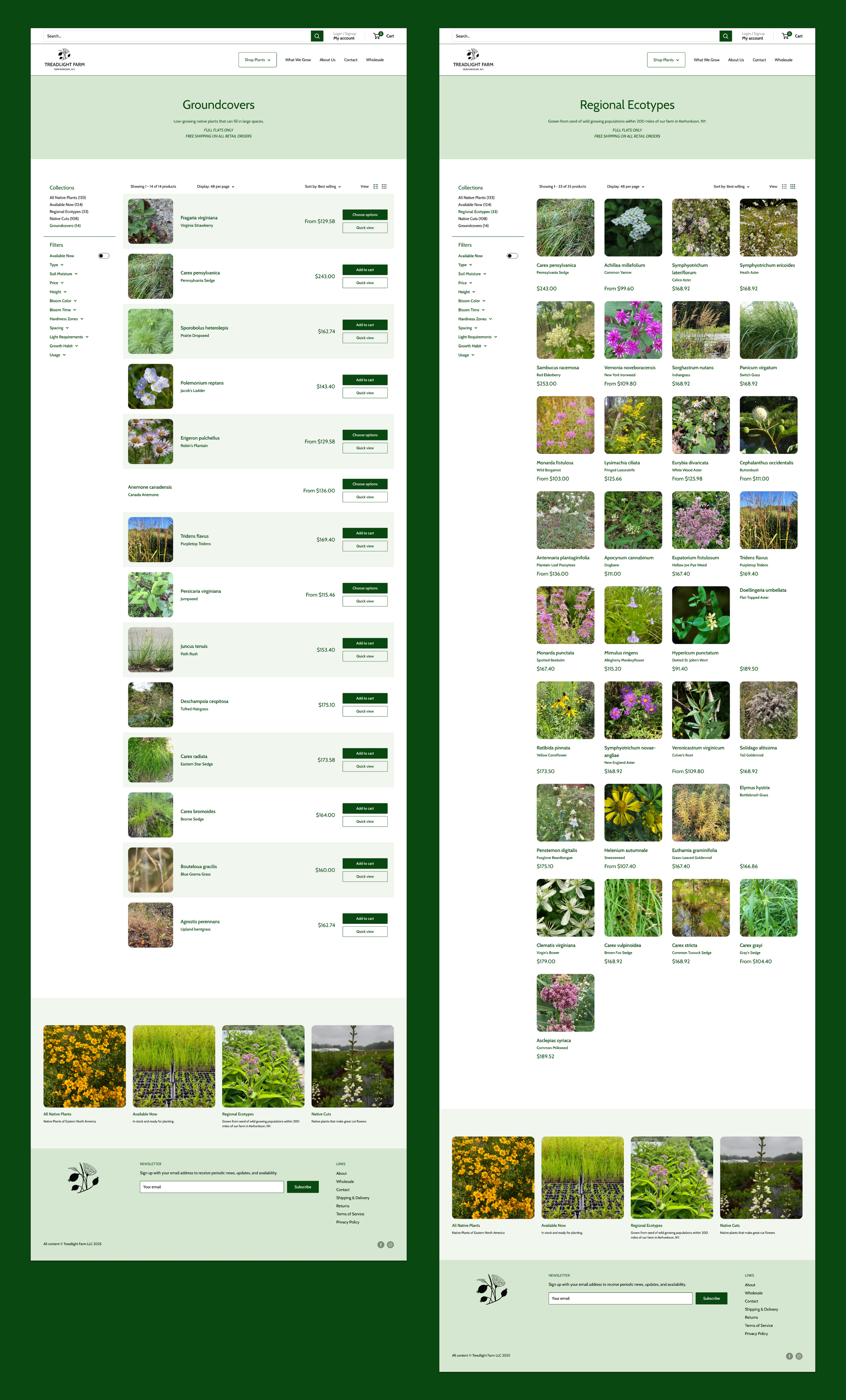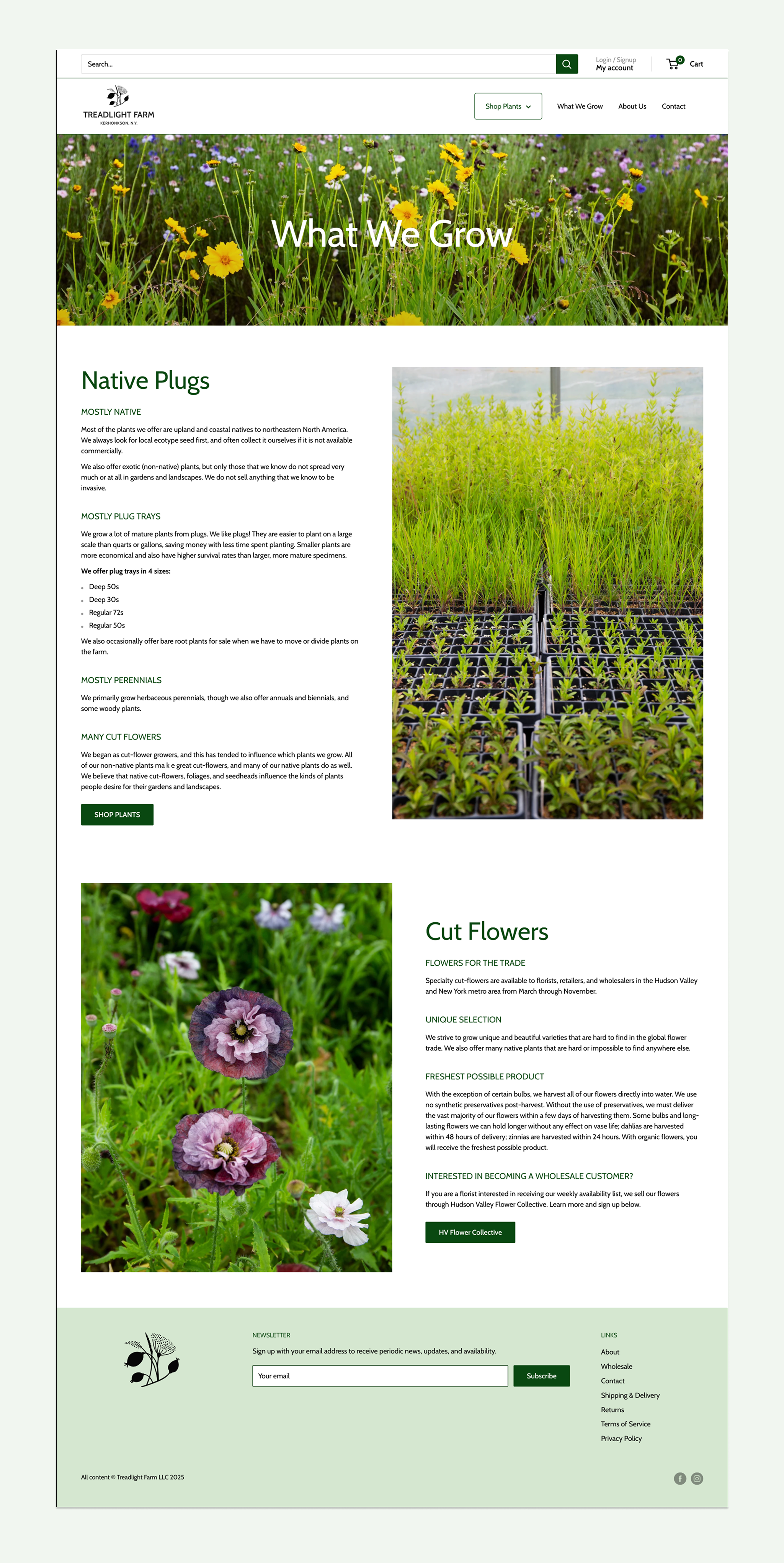 We worked with Treadlight to strategize and plan a user journey that would highlight both sides of the business—their established wholesale cut flower business, which they don’t have a strong need to acquire new customers for, and their newer wholesale and retail native plant plugs business, which they do need to acquire new customers for—all while moving customers towards a primary call to action of purchasing and pre-ordering plant plugs as they seek to grow that side of the business.